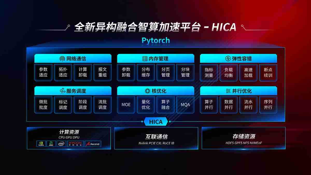 通过自研的服务层、、、中间适配层、、以及调度编排算法,,,采用数据并行、、、模型并行等多种并行方式,,把并行计算任务进行有效的分解,,使其分别由相应的软件栈和算力资源来承接。。。。当GPU资源变化,,,HICA可以实时动态调度计算子任务并调整模型拓扑和架构,,以充分聚合各种算力资源。。