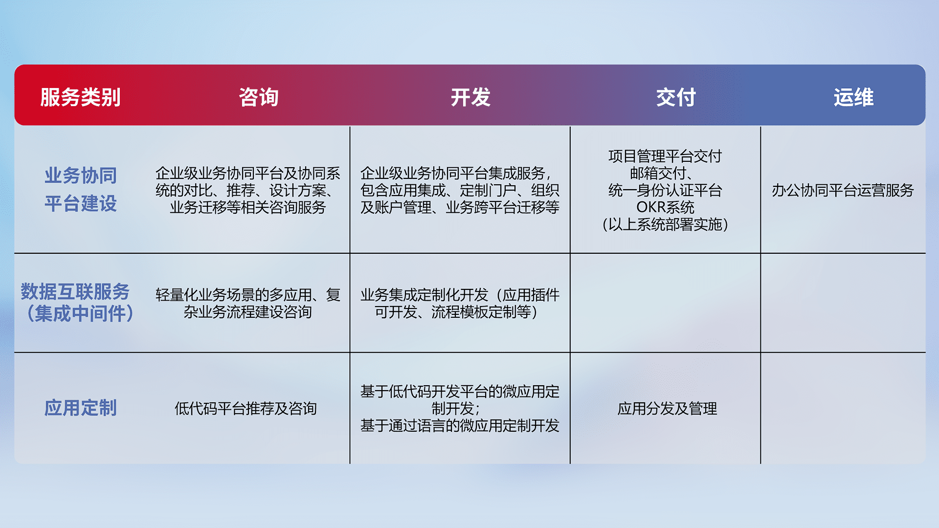 针对钉钉、、企微、、IDaas等平台级产品提供产品的规划、、方案、、交付、、、、定制化开发等服务,,,实现如统一协同办公、、智能客户服务、、、混合会议管理、、智能数据查询、、等业务场景,,实现数字化转型。。。
